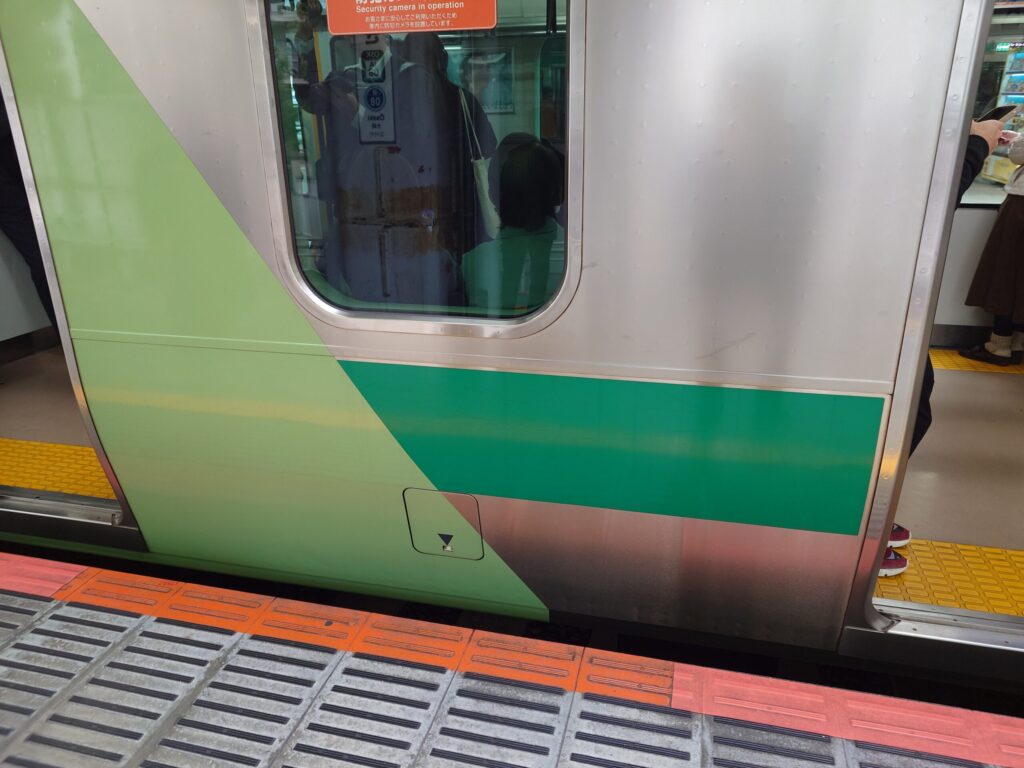 鶯色なのは先頭のドアの後ろまで。最近の流行りのラッピング形式。どうせなら一両ぐらい全面ラッピングしても良さそうだけど、誤乗防止とかで難しいんでしょうかね。