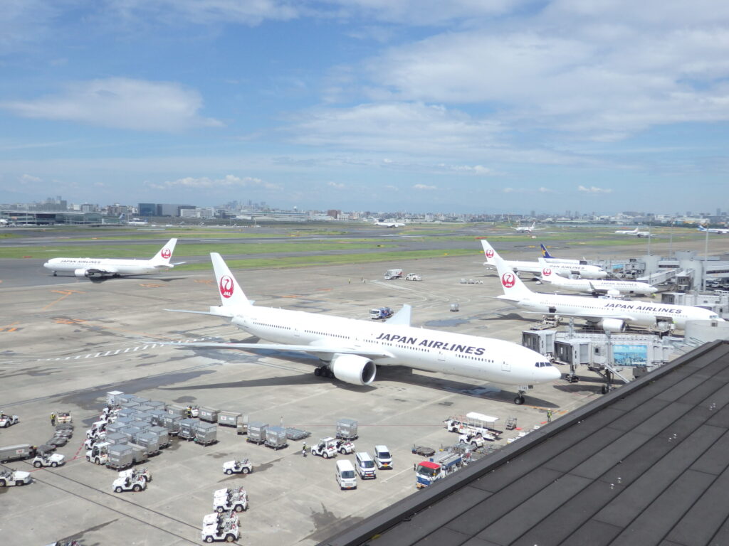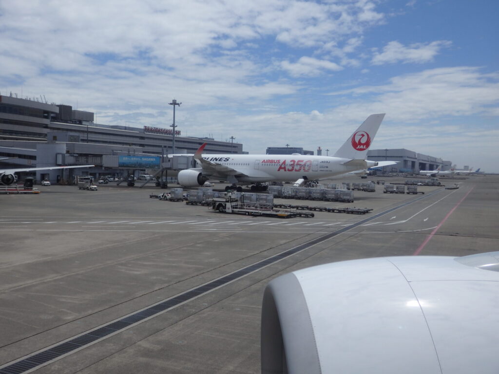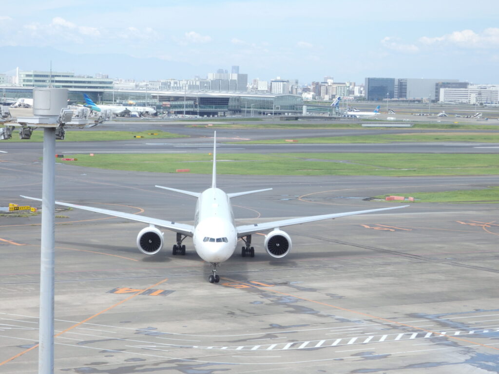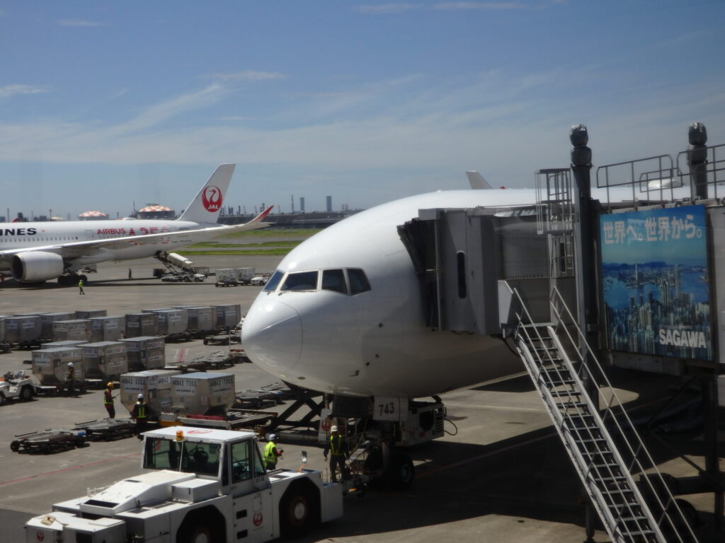 さて、羽田空港に着いたものの、出発まで1時間ほど余裕があるので、展望デッキにて搭乗する飛行機をお出迎え。