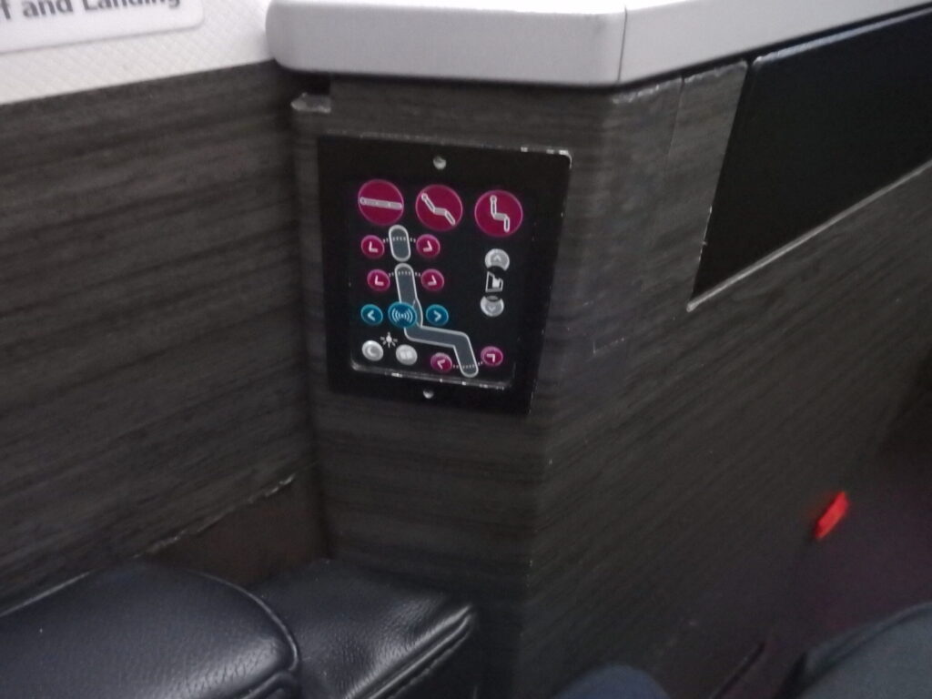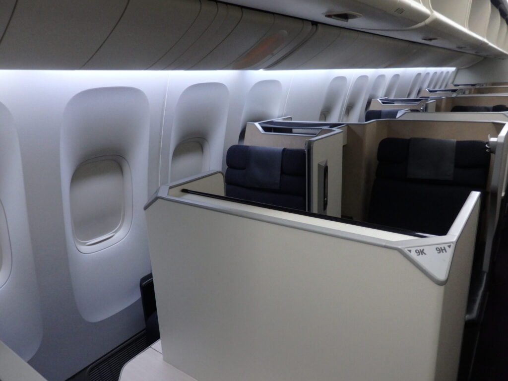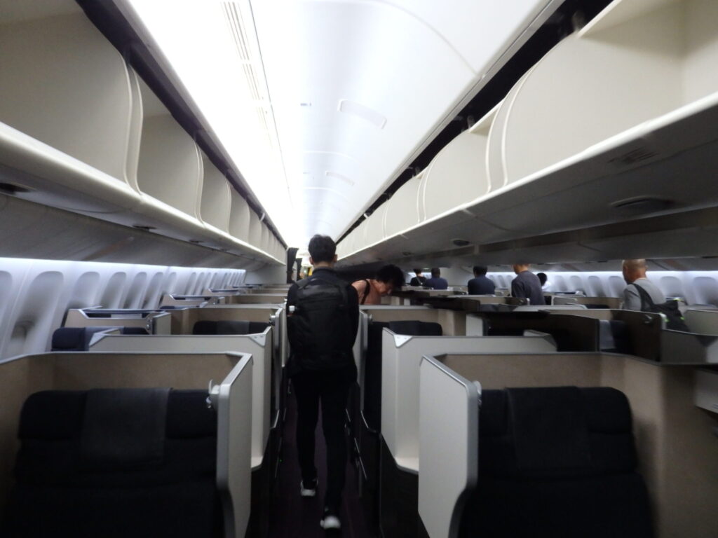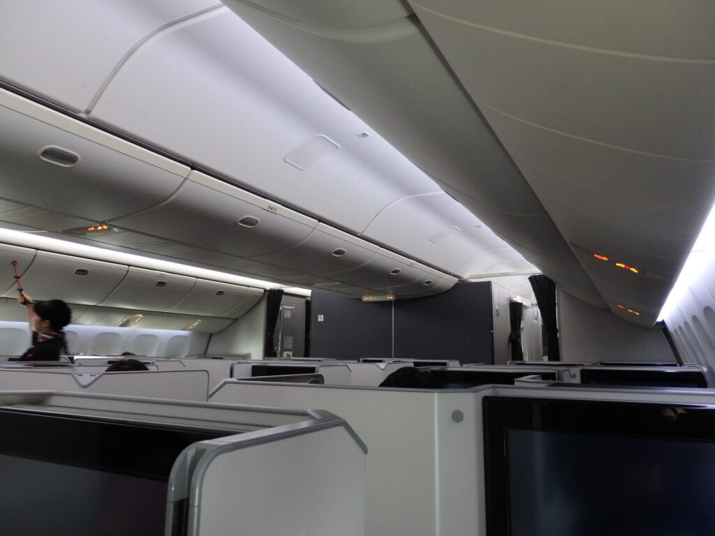 ビジネスクラスのエリアへ。荷物入れが空いているので、構造物が多くて少し窮屈な見た目。