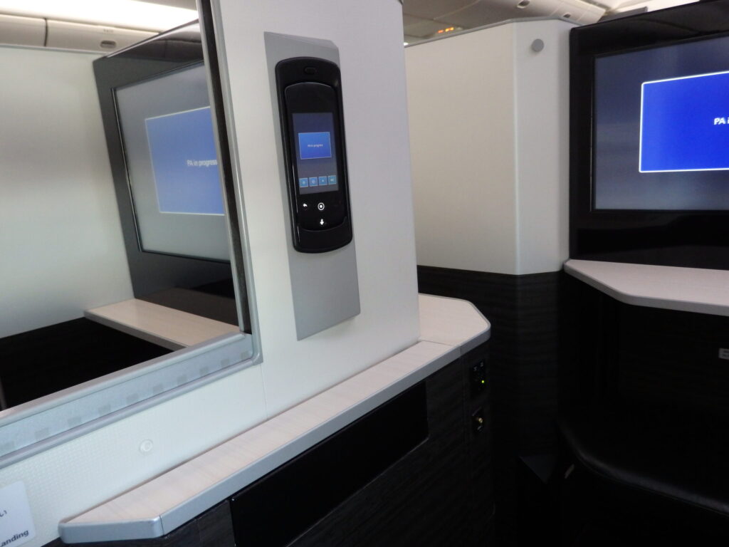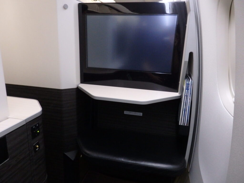 隣の席とはパーティションで隔てられるが、離着陸の時はフルオープンなので、隣のモニターなどが視界に入る。少し気になるけど、これは仕方がないところ。あと、壁には出っ張りがあるので、ちょっとした物置に使えて便利。