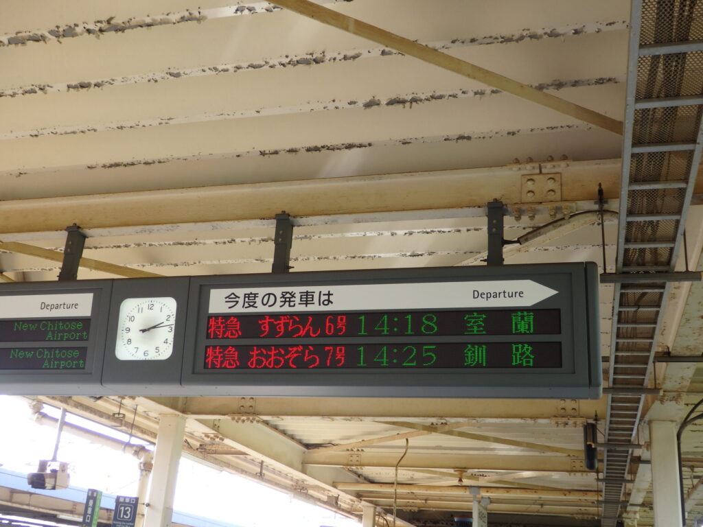 帰りの特急券の引き換えのためだったか、券売機あたりに向かう。そこでは、高校生ぐらいの女性2人が3駅先の苫小牧に行くのに特急に乗るかどうかで悩んでいた。確かに次に来るのは特急であり、普通列車はその30分後。しかし特急に乗るとなると、乗車券680円に加えて特急券1180円がかかるので、悩ましいところだろう。自由席が無くなって、こういった近距離の移動に、気軽に特急を利用しにくくなった気がする。