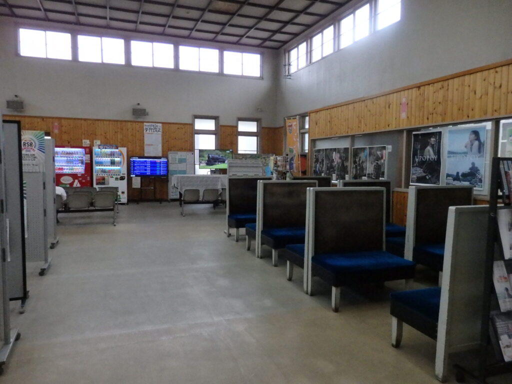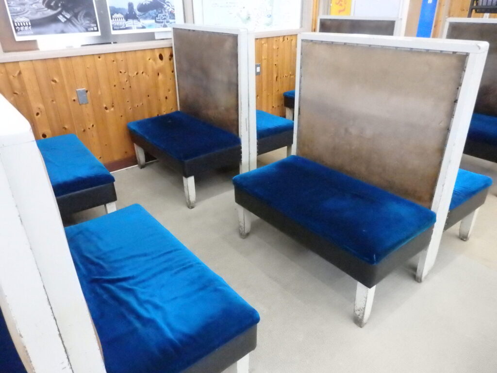 中の待合スペースはこんな感じで、昔の客車?の座席が再利用されていた。
