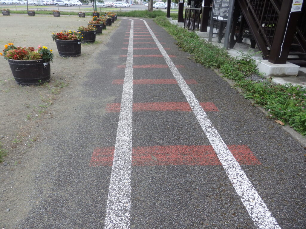 脇の道路も、線路をモチーフにしたデザインになっていた。