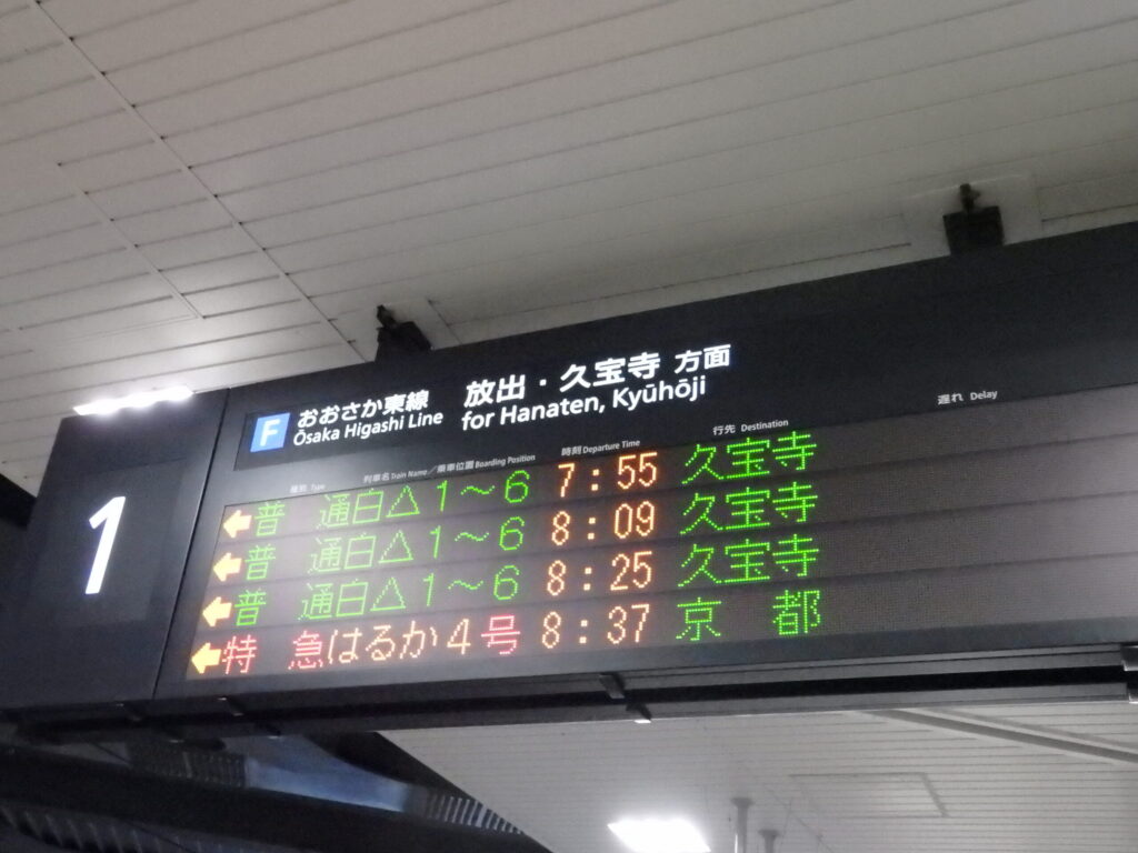 このホームへは、基本的には大阪駅の地下ホームに乗り入れる列車が発着する。乗るのは7:55発の久宝寺行き。ってか、この1時間半後には空港に着いてなければならないのか。