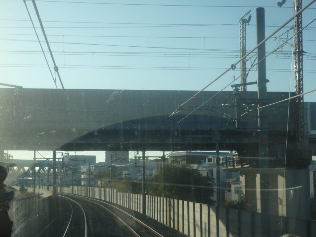 おおさか東線は基本的に高架線。でも、さらに高いところを走る東海道新幹線の高架をくぐる。