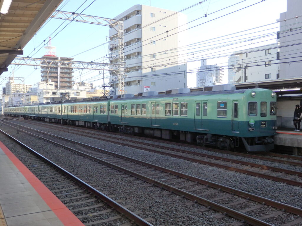 向かい側のホームに到着した中之島行きの普通列車は2200系。車番で調べてみると1967年製と信じられないくらい古い車両で、しかもリバイバル塗装。思わず「うわー」と身悶えてしまった。あっちに乗っておくべきだったな・・・