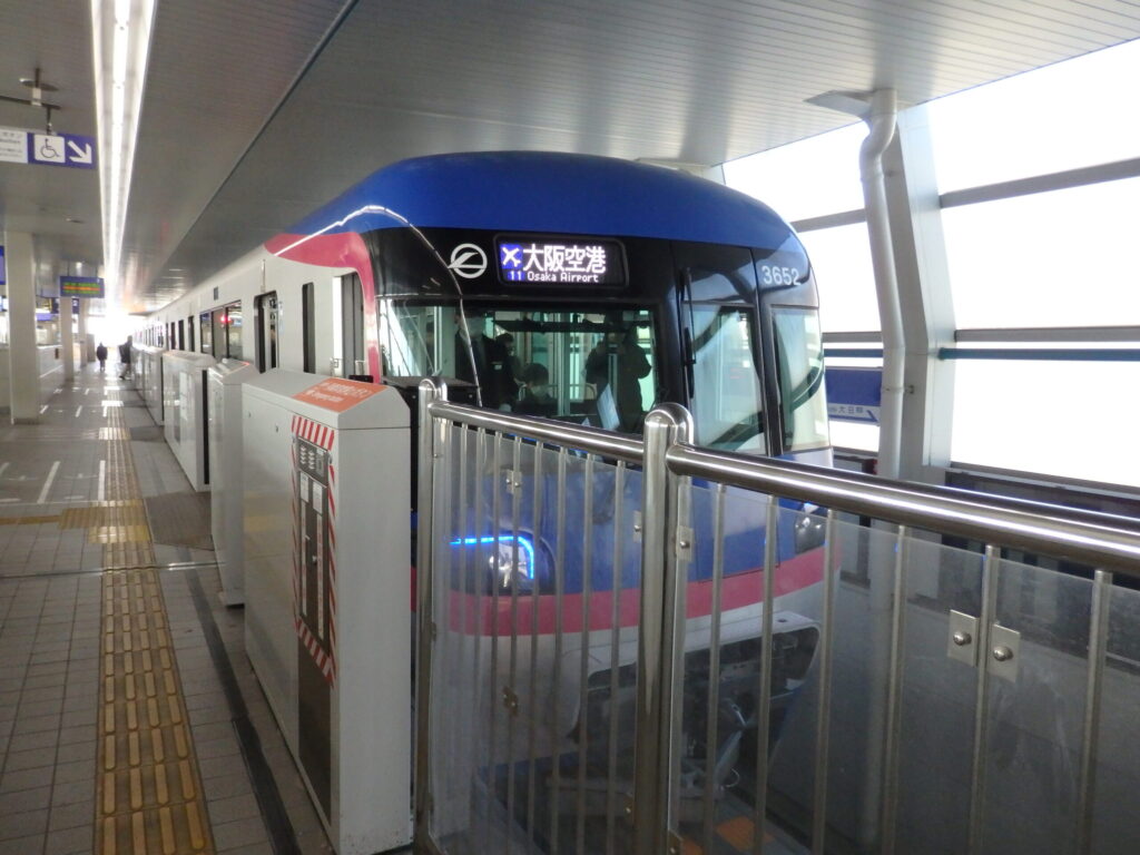 こちらに乗れば、40分ほどで大阪空港に到着する。門真市駅の時点で席は埋まっており、利用客は多いようだ。モノレールの運転台の後ろの席は展望席になっているのだが、この列車が空港に着くのが保安検査の締め切りの12分前なので、座るために一本落とすわけにはいかない。