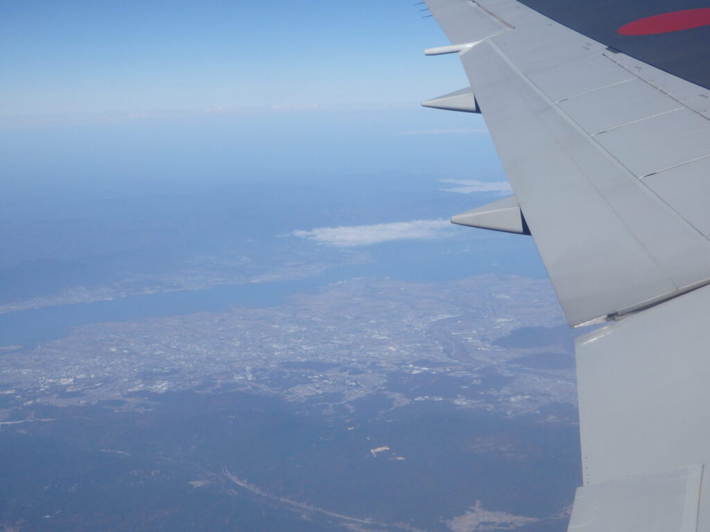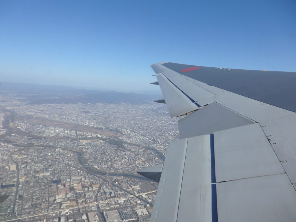 こちらも離陸。いつも通り北向きに離陸し、左回りに270度旋回して東京へ向かう。眼下に大阪空港が見える。