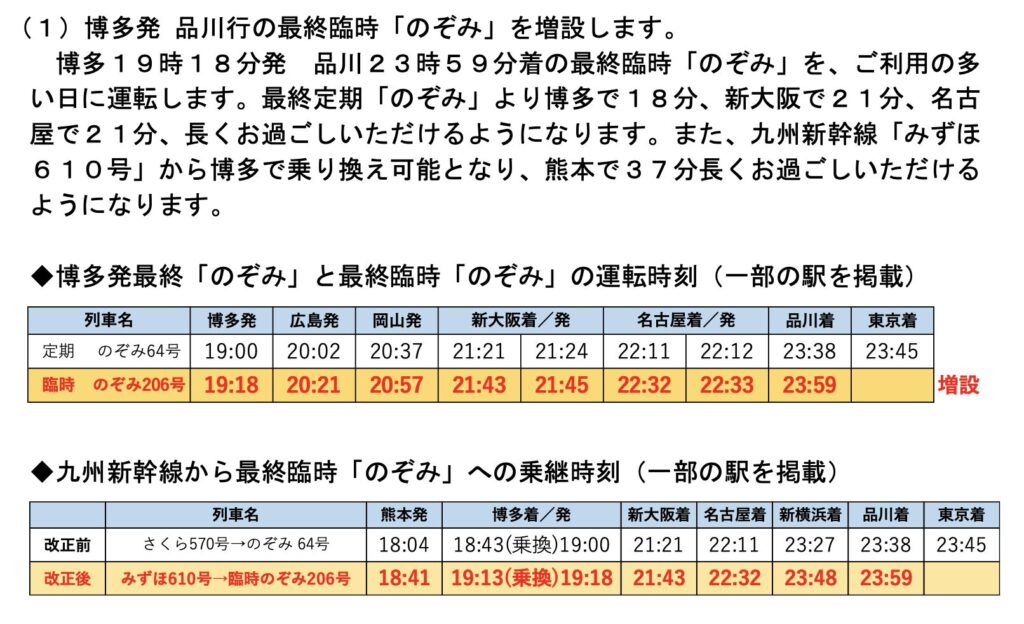 運転日は限られるものの、現行の最終のぞみから20分も遅い時間に品川行きののぞみが設定されることとなる。大阪での滞在時間が20分も延びること、関西に行ったら友人と飲んで最終の新幹線で帰っている身としては、その時間の貴重さが痛いほどよくわかる。