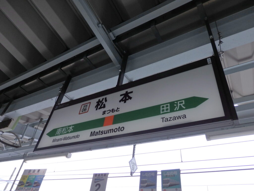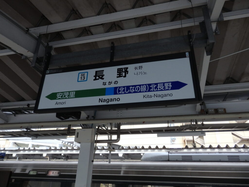 長野駅の駅名標。この駅以北がしなの鉄道、これから乗車する松本駅までの区間はJR篠ノ井線。