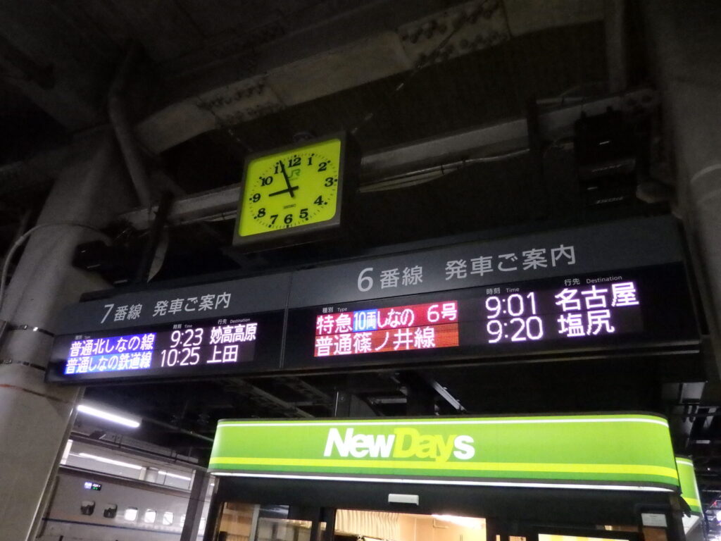 こちらが降り立った6・7番線の発車案内。各方面への列車が発着しており、(飯山線と特急しなのを除いて)特に決まった運用はないようだ。そしてこれから乗車する特急は、10両編成のようだ。