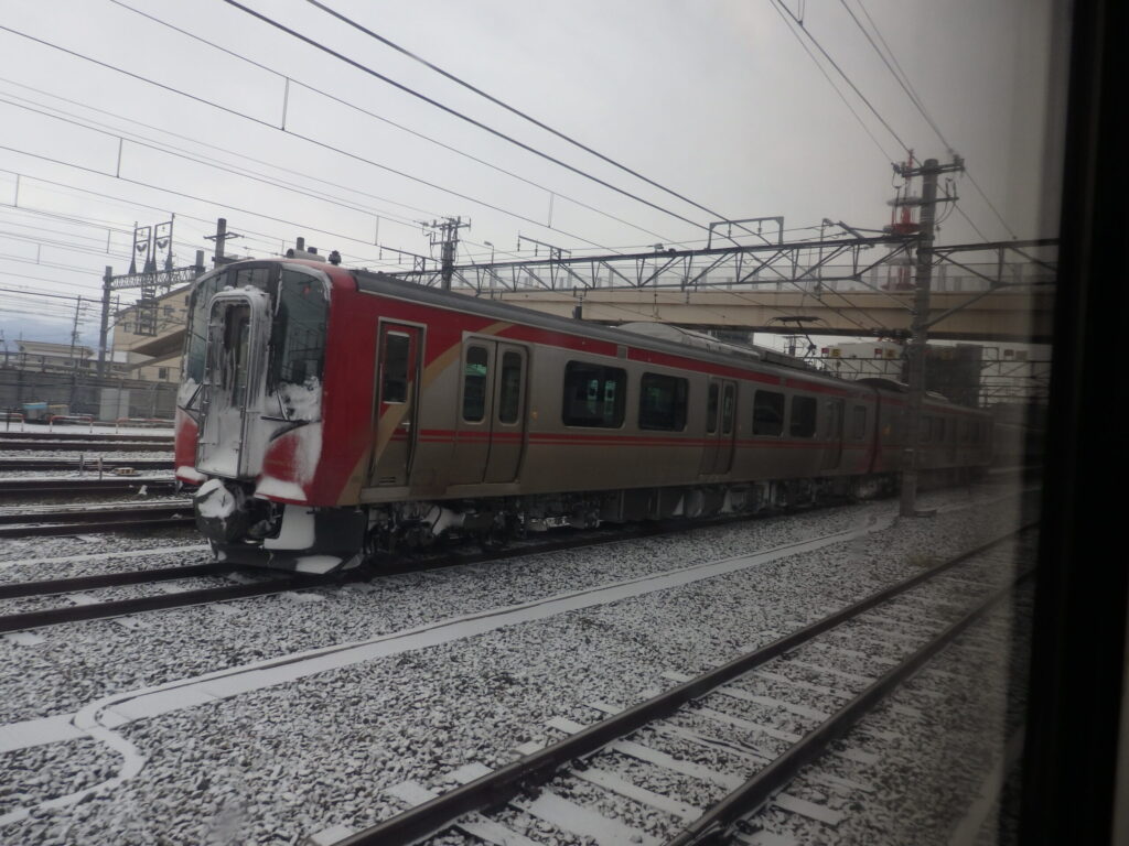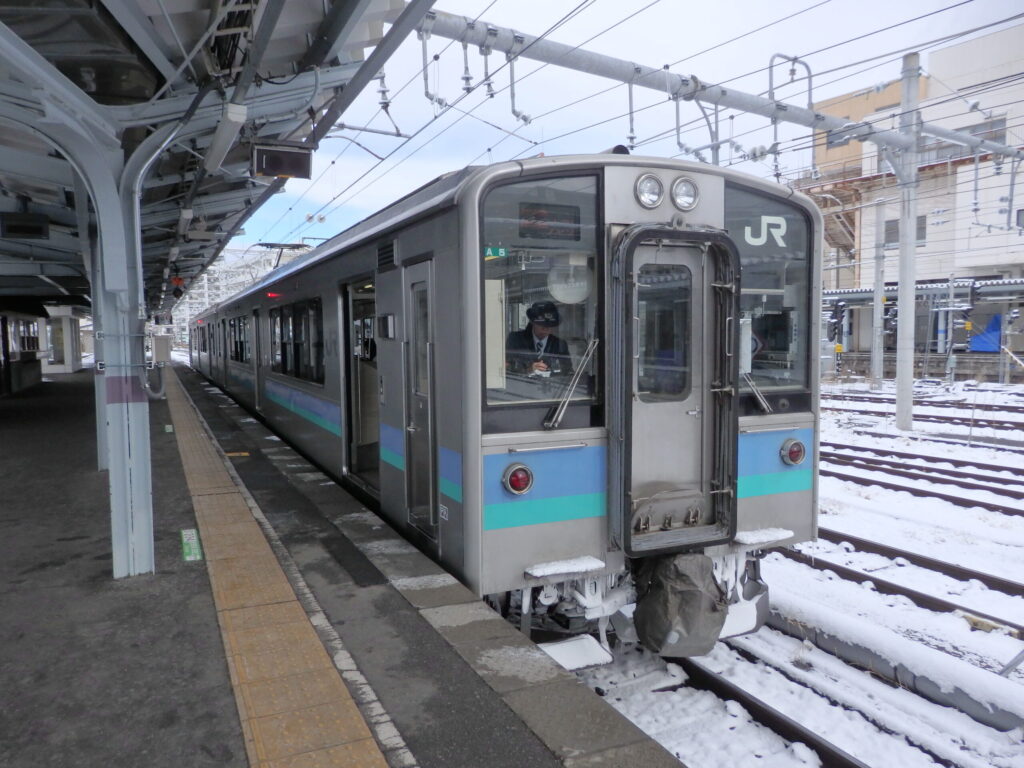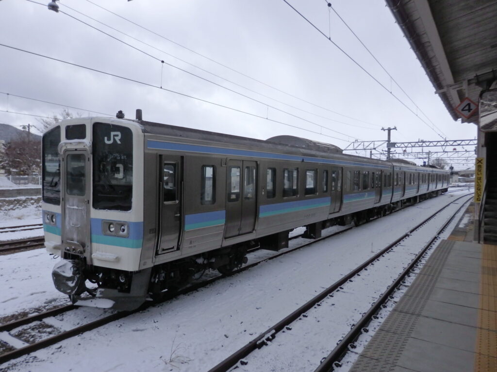 もう少し進むと、大糸線が見えてきた。大糸線といえばのE127系。座席配置が独特で、通路を挟んでアルプス側がボックス、反対側がロングシートとなっている。ボックスに座ると、ロングシートの人の視線が気になりそう。