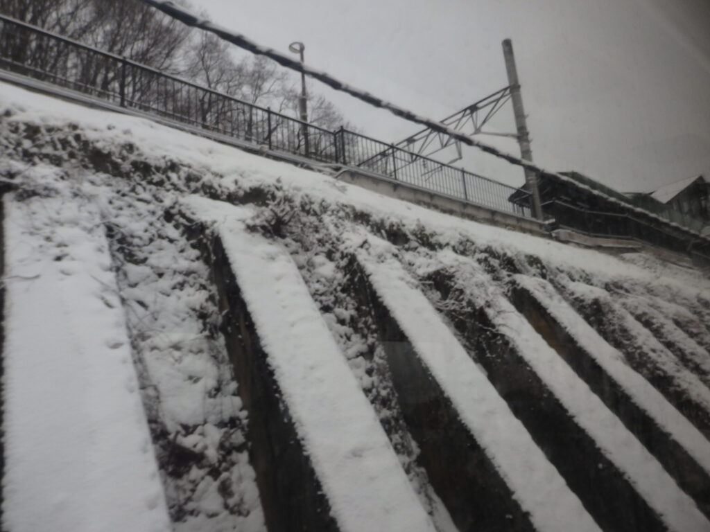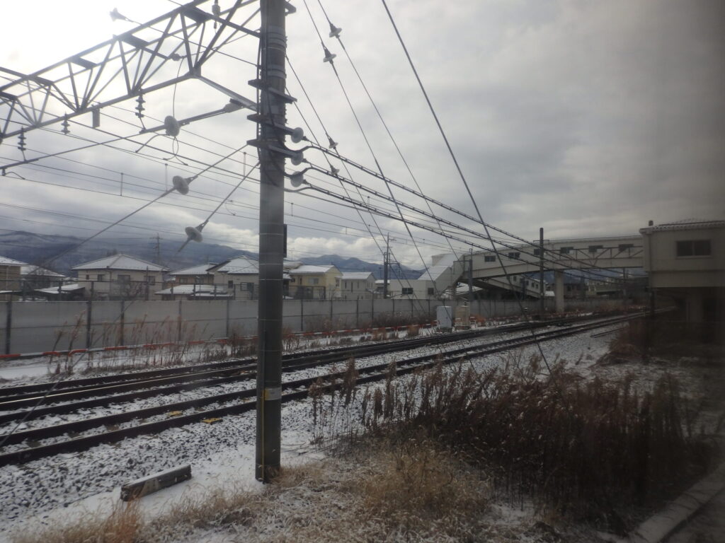 雪の姨捨の景色。日本三大車窓に数えられるところであり、冬に訪れたのは初めて。