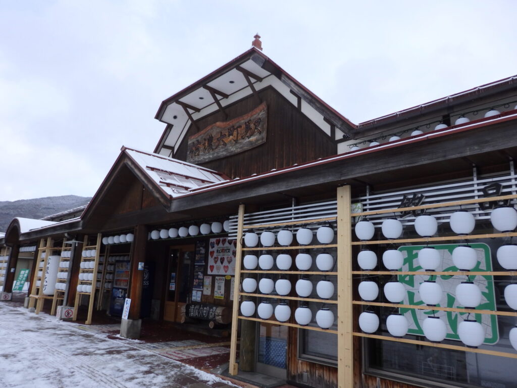 信濃大町駅の外観。ちょうどイベントの時期で提灯が飾られていた。