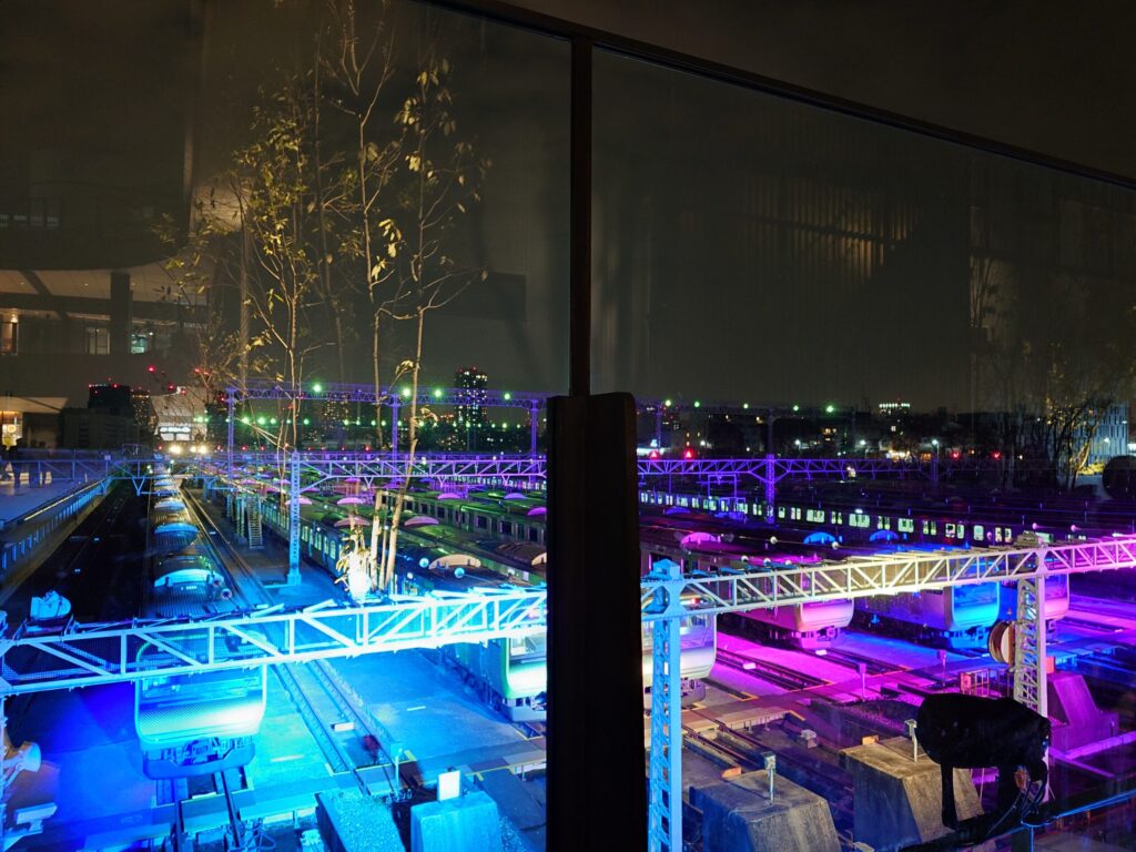 車両基地を一望できるところ。ライトアップされていて、写真を撮る人だかりが絶えなかった。